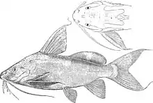 The fish has three pairs of barbels. The maxillary barbels are on located on the upper jaw, and two pairs of mandibular barbels are on the lower jaw. The maxillary barbel is straight without any branches, with a wide membrane at the base.[5] It extends 1+3⁄5 the length of the head.[5] The outer pair of mandibular barbels is about twice as long as the inner pair.[5]