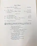 Many compositions were proposed including by students and faculty alike; "Majestic Swells" by George W. Elliot ('73), "Waiting" by Melville J. Wells ('75), "All Hail" by George E. Smith ('76), "Alma Mater" by Alice E. Clark ('82), "Singing in the Hall" by Frank W. Noxon ('92), "O’er the Vale" by William C. Stickles ('07), "Alma Mater, Syracuse" by Professor John H. Clark, "Syracuse University Song" by librarian H. O. Sibley, but none stuck and students deplored the dearth of Syracuse Airs.[3] "Oh, Syracuse", composed by Harry S. Lee ('99) in 1898 became popular among students and alumni and was first sung at the Athletic Benefit at the Wieting Opera House on 19 February 1898. Another addition to this collection was "Rally all ye Sons of Syracuse," composed by Professor Ernst Held in 1904. It was sung for the first time at the first annual banquet of the Central New York Alumni Association held at the Yates Hotel in Syracuse on 21 January 1904.[1] In early 1904, the Albany Alumni Association released a pamphlet titled "Songs of Syracuse."[1]