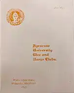 Junius Woods Stevens' composition "The Vale of Onondaga," created in 1893, gained widespread popularity and became a general favorite. It first premiered in a March 15, 1893, performance by the University Glee and Banjo Club at the Wieting Opera House.[1][4][5] The program for the event lists it under the original title of "Song of Syracuse",[6] but it was also occasionally called "Flag We Love".[4][7] While the original handwritten copy of the song includes three stanzas and a chorus,[8] SU's athletics website only lists the verse and the chorus.[9][lower-alpha 1]