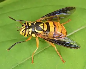 Many species in Spilomyia are wasp mimics with black and yellow patterns and using the black front legs to imitate the wasp antennae. [39] The eyes on Spilomyia species are a distinctive characteristic which usually display vertical, and irregular stripes or blotches.[40]