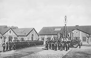 In 1875, a military hospital was set up at the Foundry.[9] In December 1876, the Foundry became a storage Arsenal. The machines of the factory were transferred to the main Arsenal in Bucharest, while its armory workshops were to function as a branch of the Bucharest Arsenal.[2] In 1887, it became the Central Artillery Depot Arsenal (Arsenal de Depozit Central de Artilerie), and in 1904 it was linked to the CFR station by a rail line up to the premises of the Arsenal.[3]