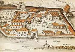 ![]() The former Töss Monastery in a drawing by the historian Heinrich Murer (17th century) | |