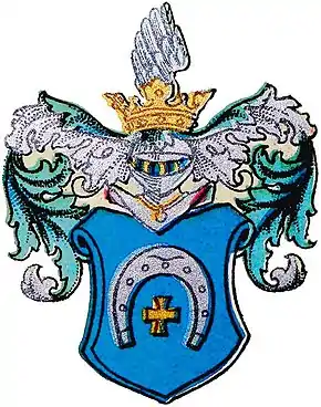 The blazon can be translated as: On a blue field an upright standing horseshoe with a golden cross in the center. Blue mantling with silver and gold. In the crown a black wing.