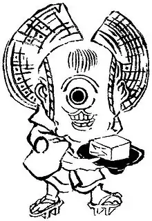 In the literature of the early Edo period, there are many kozō (boy monks) with large heads, and in the aforementioned "Bakemono Shiuchi Hyōbanki", it stated "the monster called tōfu-kozō has a large head (豆腐小僧といふ化物は頭大ぶりにて)", and in the kibyōshi"Bakemono Chakutōchō (夭怪着到牒)", they were stated to be "large-headed kozō", thus putting a big emphasis on their large heads.[3] In the late Edo period, they were often depicted with one eye.[1][7] In kyōka e-hon such as the Kyōka Hyaku Monogatari, they can also be seen without any particular traits that make them look any different from a human.[9]