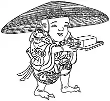 They are generally depicted wearing bamboo and kasa on their heads, and possessing a round tray with a momiji-dōfu on it (a tōfu with a momiji (autumn leaf) shape pressed into it[6]). The patterns on the clothing they wear, for the sake of warding off smallpox, include lucky charms such as harukoma (春駒), daruma dolls, horned owls, swinging drums, and red fish, and sometimes lattice patterns of the child that shows its status as a child can also be seen.[4]