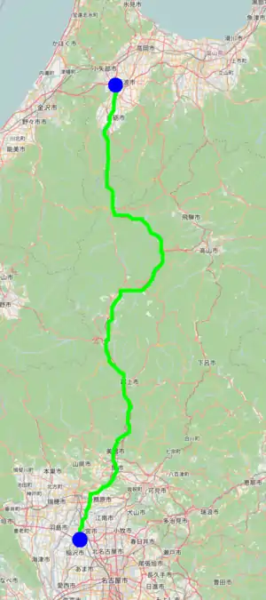 The expressway begins at a junction with the Meishin Expressway to the northwest of the Nagoya urban area and follows a northerly course into Gifu Prefecture, passing the capital Gifu and heading further north into the mountainous Hida region. The expressway also passes by Shirakawa-gō and Gokayama, two UNESCO World Heritage Sites straddling the border between Gifu Prefecture and Toyama Prefecture. The expressway continues north through western Toyama Prefecture to its terminus at a junction with the Hokuriku Expressway and the Nōetsu Expressway.