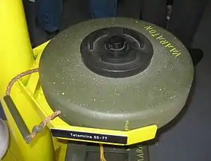 The TM 65 (Telamiina 65) is a circular Finnish minimum metal anti-tank blast mine. It is broadly based on the Russian TM-62 mine. The mines body is made from a thin shell of fibreglass over a cast block of explosive, with a central fuze well that holds the pressure fuze. The original TM 65 used a US-65 fuze as used in the SM-65 anti-personnel mine, the later TM 65 77 uses a pressure fuze similar to the Russian MV-5 fuze called Painesytytin 77.