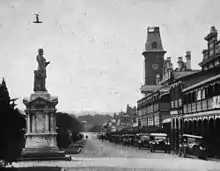 The pedestal was erected at the intersection of Palmerin and Grafton Streets – in the centre of town opposite the post office – on 25 November 1902, and the statue was raised to face the rising sun (looking east along Grafton Street) at daybreak the next day. The whole monument weighed 26 tons, rested on a concrete block and plinth of Melbourne bluestone, and stood 19.5 feet (5.9 m) high. Inscriptions on the four sides of the pedestal read: