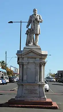 In June 1901 the Warwick committee accepted a tender of £500 by Andrews Bros of Sydney for a marble statue of TJ Byrnes, resting on a marble pedestal. The statue was carved in Italy from Carrara marble and arrived in Sydney about September 1902. Both the statue and the veined Sicilian marble pedestal, designed by ED Andrews, were freighted from Sydney to Warwick by New South Wales and Queensland railways free of charge, and were erected in November 1902 under the supervision of Warwick architect Conrad Cobden Dornbusch.[1]