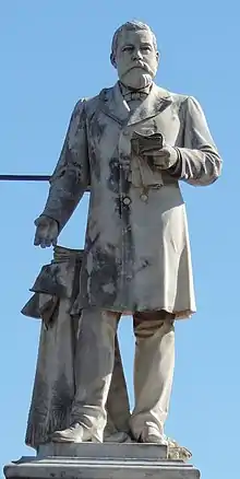 The lifelike statue stands larger-than-life at approximately 2 metres (6 ft 7 in) in height. It is carved of a fine white marble. The figure stands as if addressing an assembly, with right hand extended and a manuscript in the left hand. The head is bare, and the figure is clothed in conventional 19th century morning costume.[1]