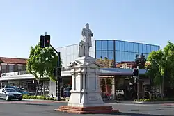 This monument was erected in 1902 by the citizens of Warwick and district to honour the former Premier of Queensland and MLA for Warwick, Thomas Joseph Byrnes, who died on 27 September 1898 at the age of 37. He was the first Queensland-born premier of Queensland, and had held office for only five months prior to his death. The sudden loss of this youthful, charismatic leader shocked Queenslanders, who mourned the passing of his vision of a strong and vibrant Queensland as much as of the man himself. Byrnes is the only Queensland premier to be honoured with two memorial statues (the other being erected in 1902 on the corner of Wickham and Boundary Streets in Petrie Bight, Brisbane and relocated in 1925 to Centenary Place), and is one of only three Queensland premiers (along with Sir Charles Lilley and Thomas Joseph Ryan) to have a medal for scholarship posthumously endowed in his name.[1][2]