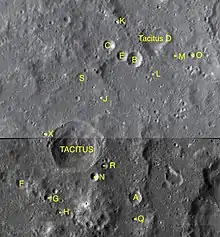 By convention these features are identified on lunar maps by placing the letter on the side of the crater midpoint that is closest to Tacitus.