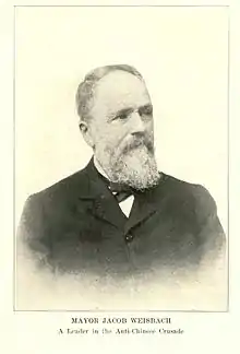 On February 21, 1885, Mayor Weisbach called a mass meeting at the Alpha Opera House to discuss methods of expelling the Chinese population of Tacoma. Roughly 900 of Tacoma's 6,936 total citizens came to the meeting. The crowd was mostly male and white, and the crowd represented nearly half of the town's electorate.[25] A former alderman, J. E. Burns, suggested passing sanitation laws to enable the city to evict Chinese residents and burn down Chinese homes.[27] Reverend J. A. Ward suggested that white property owners cease selling and leasing property to the Chinese community.[27] Weisbach roused the crowd with a closing speech, stating: "If the people are in earnest, if they are Free Americans in fact they will not yield up their homes and business to the filthy horde."[27] The crowd adopted a resolution to exclude Chinese people from Tacoma and discourage citizens from employing any Chinese people. The resolution stipulated that any citizen who did not boycott Chinese employment would have their name published.[28]