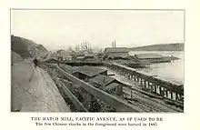 In 1873, the Northern Pacific Railway announced plans to situate its western terminus in Tacoma. Given the experience of Chinese laborers on other major railroad projects, they were among the laborers that were hired to work on the new construction.[8] The Northern Pacific Railway completed its Tacoma terminal on December 27, 1873.[9] Because there was still work to be done building wharves and smaller rail lines, Chinese workers remained in the area. The Northern Pacific Railway leased the Chinese land near the train tracks which became the Tacoma Chinatown.[10] This was located on the Tacoma waterfront near present-day Downtown Tacoma.[10]