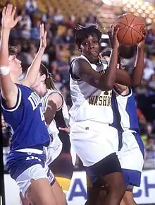 Tajama Abraham Ngongba (born September 27, 1975)[1] is a former professional basketball player in the Women's National Basketball Association.[2] Abraham attended George Washington University and was the 31st draft pick in the 1997 WNBA draft.[3] She played for Sacramento Monarchs in 1997[4] and Detroit Shock in 1998.[5] Abraham took a position as the women's Assistant Coach of basketball at George Mason University in 2013.[6]