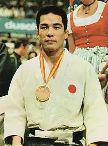 Kawaguchi began training in judo at age 5 under his father, who was a local judo coach.[1] He later won an inter-highschool judo tournament, and in 1969 entered Meiji University.[1] In 1971 he defeated the future Olympic gold medalist Toyokazu Nomura in the world championship final, and became the Japanese representative for the 63 kg division at the 1972 Summer Olympics.[2] After two quick victories in the first and second rounds of the Olympic competition, Kawaguchi faced Mongolian judoka Bakhvain Buyadaa in the third round, and broke two ribs while escaping from Buidaa's ground pin.[2] Coach Akio Kaminaga suggested Kawaguchi to withdraw, but Kawaguchi continued, and advanced to the semifinal with a close decision victory. He won the semifinal against Kim Yong-Ik of North Korea with a yoko-shiho-gatame, only to face Buidaa in the final. In contrast to their previous bout, Kawaguchi quickly pinned Buidaa with a kouchi gari, and won with a kami-shiho-gatame within 39 seconds. Buidaa was later disqualified for failing a drug test.[3]