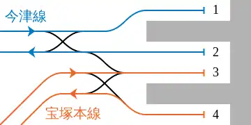 4  Takarazuka Line for Kiyoshikōjin, Nakayama-kannon, Kawanishi-Noseguchi, Ōsaka (Umeda), Minoo, and Kyōto