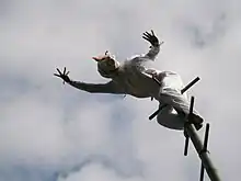 At the end, the fox at the top of the male bamboo throws around some small rice cakes (mochi), pulls out of a pocket in his garb a chicken and lets it fly to the ground. Eventually both foxes go down the poles with a spectacular slide.