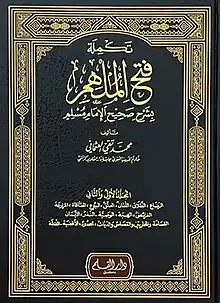Takmilah Fath al-Mulhim bi-Sharh Sahih al-Imam Muslim (Arabic: تكملة فتح الملهم بشرح صحيح الإمام مسلم) is a six-volume Arabic commentary on Sahih Muslim, authored by Taqi Usmani. It serves as a supplement to Fath al-Mulhim bi-Sharh Sahih al-Imam Muslim, a work initially written by Shabbir Ahmad Usmani, who completed three volumes before his demise. Taqi Usmani commenced writing this scholarly work in 1976, inspired by his father, Shafi Usmani, to carry on and complete the unfinished endeavor. After an 18-year journey, he finalized the book in 1994, earning widespread recognition for its quality. The commentary covers essential topics, including fiqh, justice, politics, economics, social policy, morality, virtues, and other aspects of Islamic teachings. Taqi Usmani's work is particularly known for its analysis, incorporation of diverse languages, inclusion of biographies, fiqh methodologies, and relevant fiqh rulings, making it a reference for both students and scholars alike.[1]
