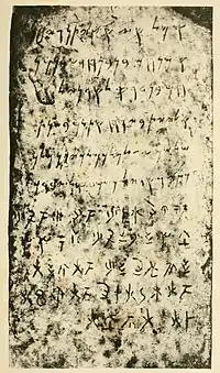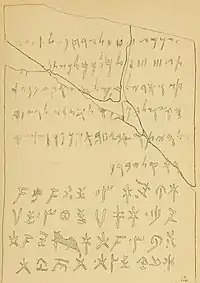 - 1 2 Letter from Professor Wright, 15 December, 1886; in the Proceedings of the Society of Biblical Archaeology: "Among the objects from Cyprus exhibited during the past summer at the Colonial Exhibition were two bilingual inscriptions, Phoenician and Cypriote, the property of Colonel F. Warren, R.A., who discovered them during his excavations at Frangissa... The longer and better preserved of these has been translated and published by the well known archaeologist M. D. Pierides, though without the Phoenician text... The smaller of Colonel Warren's two bilinguals is not nearly so well preserved, especially as regards the upper or Phoenician portion. I have sent a squeeze of it to Professor Euting, who will no doubt succeed in deciphering it with Dr. Deecke's help."