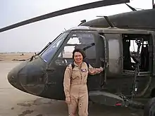Following in the footsteps of her father, who served in World War II and the Vietnam War,[8] and ancestors who served in every major conflict since the Revolutionary War,[9] Duckworth joined the Army Reserve Officers' Training Corps[26] in 1990 as a graduate student at George Washington University.[27][28] She became a commissioned officer in the United States Army Reserve in 1992 and chose to fly helicopters[26] because it was one of the few combat jobs open to women at that time.[29] As a member of the Army Reserve, she went to flight school, later transferring to the Army National Guard and in 1996 entering the Illinois Army National Guard.[26] Duckworth also worked as a staff supervisor at Rotary International headquarters in Evanston, Illinois,[30][31] and was the coordinator of the Center for Nursing Research at Northern Illinois University.[32]