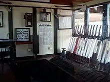 Moveable objects at the signal box complex include a platform lamp oil, (AA01); three cane hoops, two large, one small; a collected tickets box (AA13); compactus in the training room; a sign, pillows for hire 1/-, 0.5/0.5, (AS01); a circuit phone wall mounted timber, (AT01); a timber rotating chair with leather cushion and central cut-out, (CA03); and a timber table and ruling rod, 0.9/0.7/0.8, (TA01).[2][8]
