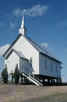 On 26 September 1926, an Apostolic church was opened by Reverend W. Neimeyer.[5][6] It was at 103 Wittenberg Road (26°02′24″S 152°02′18″E / 26.0399°S 152.0384°E). Circa 1997, the church was relocated to 19 Olive Street, Goomeri.[7][8][9]