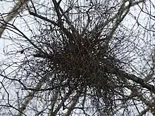 Witches broom on birch trees (Betula species), are dense bunches of stunted twigs which look like birds nests. The gall starts as densely packed clusters of buds which can remain for many years. Possibly, when the fungus loses vigour, the buds grow into many slender shoots. In the spring, asci form on small leaves which grow on the shoots. These leaves usually fall before the normal leaves grow elsewhere on the tree.[3] There can be several witches broom in a tree.[4] Witches broom, formed by Taphrina betulina can be found on dwarf birch (Betula nana), Betula nana x pubescens, silver birch (Betula pendula), downy birch (Betula pubescens) and Betula pubescens var.glabrata.[1] A phytoplasma can also form similar looking witches broom on birch.[4]