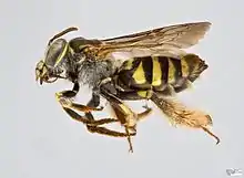 The 'Tapinotaspidini' are a tribe of apid bees. They belong to the order Hymenoptera and the family Apidae.[1] The Tapinotaspidini tribe consists of 180 different species.[2] Many species of Apidae are recognised as oil-collecting bees and Tapinotaspidini possess this oil-collecting behaviour.[1] It is maintained that mutualism exists between oil secreting flowers and oil collecting Tapinotaspidini bees.[3] Morphological and molecular phylogenies have found that the trait of oil-collecting is polyphyletic.[1] Tapinotaspidini are solitary bees which collect oil sources from flowers belonging to the families of Malpighiaceae, Solanaceae, Orchidaceae, Calceolariaceae, Iridaceae, Plantaginaceae, Melastomataceae and Krameriaceae.[1] Tapinotaspidini species differ in terms of being generalist and specialist oil-collectors.[2] Selected species exclusively obtain floral oil from one family of flowering plants, whilst many Tapinotaspidini species employ a range of plant families to fulfil their oil-collecting behaviour.[2]