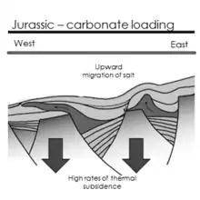 The thickest salt deposits occurred in isolated grabens and half-grabens following the initial rifting, prior to oceanic spreading leading to a series of thick salt sheets. As oceanic spreading proceeded and carbonate shelves developed, sediment loading led to the upward migration of these salt sheets due to the differences in buoyancy. Initially, these salt structures became typical salt domes and diapirs. The upward migration of salt resulted in faulting of the Jurassic carbonates and Cretaceous shales. This has created numerous blocks where hydrocarbons may accumulate. These blocks include rollover faults and anticline structures.[5][8]