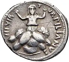 Only three icons of Tarpeia survive from antiquity: the Basilica Aemilia (c. 1st century BCE), a Republican denarii minted by L. Titurius Sabinus (89 BCE), and an Augustan denarii issued by P. Petronius Turpilianus (c. 19 BCE).[17] (See images above of "Denarius 89 BCE," "Denarius 18-19 BCE," and "Basilica Aemilia")