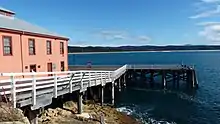 The wharf is situated on the north side of the headland to provide protection from the south. The wharf structure is sited on a rock platform that gently slopes into the ocean providing support for the piers.[2][1]