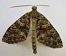 The expansion of the wings of the male is 1+1⁄4 inches; of the female 1+3⁄8 inches. On the forewings the green colouring is more or less confined to the neighbourhood of the veins and is much less pronounced than in T. tipulata; the basal and subterminal areas are transversed by several narrow cream-coloured bands, which are especially evident in the male, and the black markings are more extensive and slightly tinged with dull reddish. The abdomen of the male is considerably shorter than in the same sex of T. tipulata and the anal lope of the hind-wings nearly twice as large.[7]