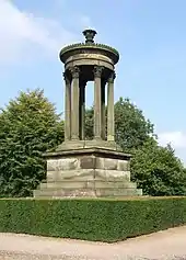 The first formal gardens were created around the early 18th-century house and consisted of a walled garden to the south of the house, a formal semicircular pond to its north and formal lines of trees to the east and west. Later Samuel Wyatt set out an avenue of beeches to the south, which is now the Broad Walk.[3] An arboretum was created during the 18th century and additions have been made to it since. The earliest reference to the arboretum is in 1795 when between five and ten species were present.[4] The first formal garden to be created for the present house was Charlotte's Garden, designed by Lewis William Wyatt in 1814. Lewis also designed the sandstone Conservatory, which was originally joined to the house by a glass passageway.[5] This was also known as the Orangery because for a time it was used for growing oranges.[6] In the 1830s, a copy of the Choragic Monument of Lysicrates in Athens was placed at the end of the Broad Walk. Gardens were established along the sides of the Broad Walk, including the Leech Pool and the area containing the Golden Brook.[7]