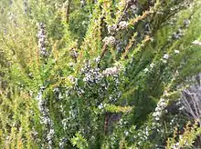 The shrub has an erect form and typically grows to a height of 3 to 4 metres (10 to 13 ft). It blooms between July and October producing white flowers.[2] It can be grown as an ornamental shrub in the garden where it is hardy and has dense foliage. The small white flowers grow in masses and the foliage is aromatic. The shrub is drought tolerant once established and will also tolerate light frosts.[1]