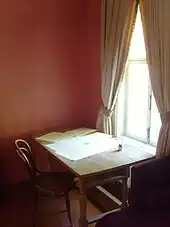 His writing desk, where he wrote letters every morning after breakfast, is at the end of the room. Over the desk, in the place of honor, is a picture of Anton Rubinstein, the founder of the St. Petersburg Conservatory of Music and his first teacher of instrumentation and composing. Just below the picture of Rubenstein is a picture of Beethoven. On the other walls are many photographs of his family, in particular of his father, Ilya Petrovich Tchaikovsky, and his mother, Alexandra Andreyevna. Nearby are two bookcases containing his musical library and his library of Russian and foreign literature, and the bound sets of magazines to which he subscribed. The other cabinets in the room are filled with gifts to Tchaikovsky, including an ink-pot in the form of the Statue of Liberty given to him during his visit to the United States.[3]