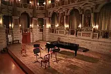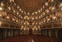 Still used for its original purposes, it now can also be visited by tourists as one of Mantua's museums.[1] The theatre is relatively small, with a scene 12,3 metres wide and 5,6 metres deep, and a maximum audience of 363 persons.[3]