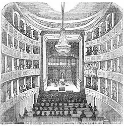 The architect was Arnould Bertin from France. Given the narrowness of the plot, it was a complicated architectural exercise. After conversion, the theatre had an elliptical shape, with boxes on four levels, consisting of 54 for the general public, 3 for the royal family (for which fees were paid), and 2 belonging to the owners. Up to 324 people could be accommodated in these boxes and there was also room for 312 in the stalls (orchestra) and galleries. The design and decoration were commented on very favourably by the Lisbon newspapers, having been done by the most prominent craftsmen in Lisbon at the time. The intention was to attract the upper middle classes, who seemed dissatisfied with other Lisbon theatres.[1][2][3][4]
