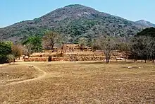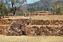 The site was a ceremonial center with a plaza surrounded by various pyramid bases and other structures.[2] The site has a distinct construction style, which consists of boulders with spaces between them filled in with layers of flat rock and red clay. This allows the structures to withstand earthquakes.[5] Of the discovered structures, eight are considered major complexes with the rest minor.[3] The most import of these is four large pyramidal structures and a Mesoamerican ball court. Some of the pyramid bases are in unusually good condition.[2] The four main structures are Encinera or Main Temple, the Palace, the Templo del Espejo de Agua and Platform W.[1] The Palace, also denominated as Building Five, is the largest on the site, with a base that measures eighty meters on each side. It has sunken patios and various courts.[3][4] The La Encinera is twenty meters tall and was the site for various rituals performed by priests and rulers. The ball court measures 37.8 meters long.[4] Platform W had residences for the elite with internal patios and drainage systems. However, the most sacred part of the site is a hill dedicated as sanctuary for the worship of water and rain.[4] Some of the minor structures include the Templo Verde, the Templo Rojo and La Anona. The last two form the Solar Group.[1]