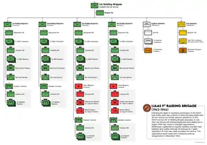 The paratroop brigades were organized into the Teishin Shudan as the first division-level raiding unit, at the main Japanese airborne base, Karasehara Airfield, Kyūshū, Japan. It was commanded by a major general, and was organized as follows: