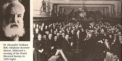 One of the early lecturers at society meetings was the inventor of the telephone, Alexander Graham Bell. Dr Bell visited Melbourne in 1910 and inspected Australia’s first automated central telephone exchange during its installation. He honoured the Society at a function held in the Exchange on 17 August 1910 prior to its formal opening.[2]