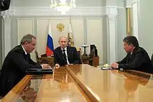 Russian president Vladimir Putin with Roscosmos head Vladimir Popovkin (right) and Dmitry Rogozin (left) in a meeting on problems in the space industry, August 2012.