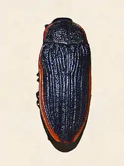 Temognatha grandis can reach a length of about 55 millimetres (2.2 in).[2] The body colour is black, with a yellow border on each side. Head and legs are black. Elytra are punctato-striate. These beetles are florivore and feed on the flowers of various trees and shrubs (especially Angophora hispida and Leptospermum species).[2][3][4] Larvae are wood-borers of Eucalyptus gracilis, Eucalyptus oleosa, Eucalyptus uncinata and Eucalyptus foecunda.[3]