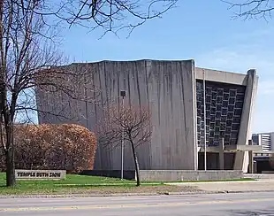 The Max Abramovitz-designed circular Modernist building features ten scallop walls, each a symbol of the 10 commandments, and two 30-foot-high (9.1 m) commandment tablets.[2] The synagogue walls rise 45 feet (14 m) from the entrance, flaring outward at 15 degrees, firmly anchored to a pedestal 50 feet (15 m) below ground level. Ben Shahn, an artist, painter and calligrapher, designed the sanctuary's stained windows, the Commandment Tablets, and the menorah.[3][4] The synagogue contains a Casavant Frères 48-rank, 4000-pipe organ. The synagogue was listed on the National Register of Historic Places in 2018,[5][6] located within the Delaware Avenue Historic District.