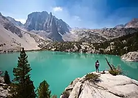 Temple Crag is a mountain peak in the Palisades group of peaks of the Sierra Nevada with an elevation of 12,982 feet (3,957 m). The peak lies east of the Sierra Crest, between Mount Gayley and Mount Alice, straddling the drainages of the North and South Forks of Big Pine Creek. The peak's north face forms the backdrop for part of the North Fork Big Pine Creek hiking trail in the John Muir Wilderness and Inyo National Forest. It is also a rock climbing destination, with its arêtes hosting the routes Venusian Blind, Moon Goddess Arete, Sun Ribbon Arete, and Dark Star.[6]