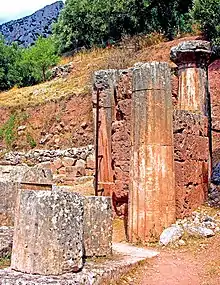 The Temple of Athena Pronaia was a temple at the ancient site of Delphi, in the Sanctuary of Athena Pronaia, a group of buildings comprising temples and treasuries as well as the famous Tholos of Delphi. There were in fact three successive temples built at the site. The earlier temples (38°28′49″N 22°30′30″E / 38.48015°N 22.50838°E), referred to as A and B, were built in the 7th and 6th centuries BC respectively and were made of porous stone; a third temple (38°28′49″N 22°30′28″E / 38.48025°N 22.50765°E) was built of limestone in the 4th century BC, although it is not certain that it actually was dedicated to Athena this time.