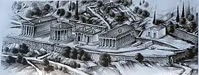 | Architectural details | Three successive temples of rectangular plan in the Doric style and one tholos, or circular building supported by Doric columns. In addition were a number of physically independent altars and a few treasuries, or buildings used for financial purposes, mainly storage of items used as currency. |