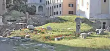 These podium remains are made up of the cement infill between the load-bearing structures. (Those structures were constructed from opus quadratum blocks, looted for reuse after the temple was abandoned and now lost.) The structure of the church of Santa Rita da Cascia in Campitelli by Carlo Maderno was moved onto this podium from the slopes of the Capitol at the time of the 1930s excavation and work on the Capitol.
