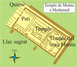 The temple's features included a tribune platform, a canal, a dromos, main gate, portico, hall, and sanctuary. There was also a courtyard for the living sacred bull.[2] It consisted of a first chamber, 200 by 180 meters. The main access was by the east and north. A sacred lake was probably on the west side of the temple. The temple consisted of two distinct, contiguous sections that have been interpreted as a temple to the north and one to the south where the priests would have had their quarters. Typical of the period, the temple was built out of brick - it included raw elements for the doors and frames, and column or carved stone, the bases of which were decorated. Carved stone would have been present in the most intimate parts of the sanctuary, but no trace of it has been discovered. No doubt these parts were considered sacred and reused in later buildings. The plan of the sanctuary of the Middle Kingdom is still subject to discussion, but it was to have at least one hypostyle antechamber giving access to chapels of worship or shrine. A large courtyard surrounded by portico columns where a sacred bull would have lived would have been revered as the hypostasis of the living Montu.