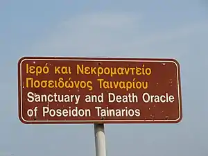 The Temple of Poseidon at Tainaron is on the extreme point of the Mani Peninsula, the middle finger of the Peloponnese peninsula. It was dedicated to Poseidon Asphaleios, meaning "Poseidon of Safety".[1]